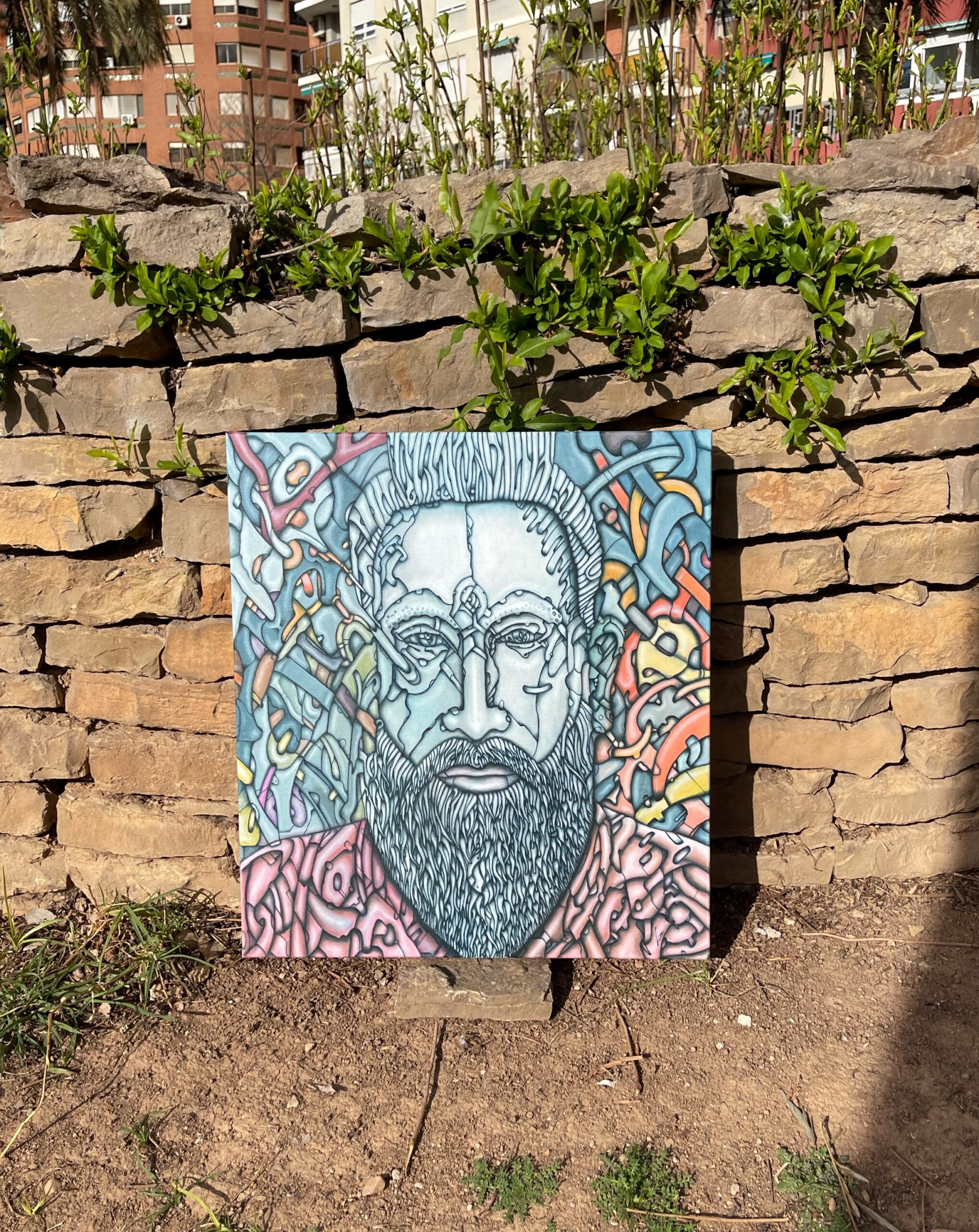 Un sujeto barbudo en azul, inspirado en rostros de hombres españoles, muchos de los cuales lucen barbas.
